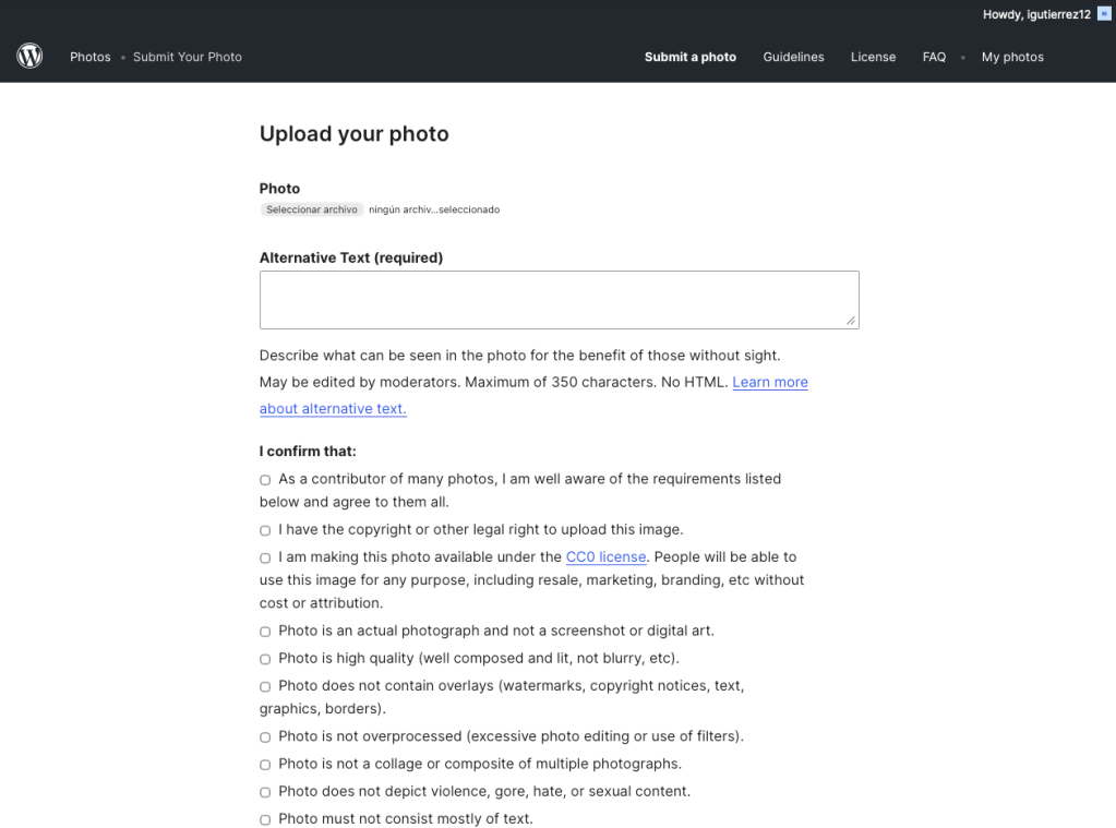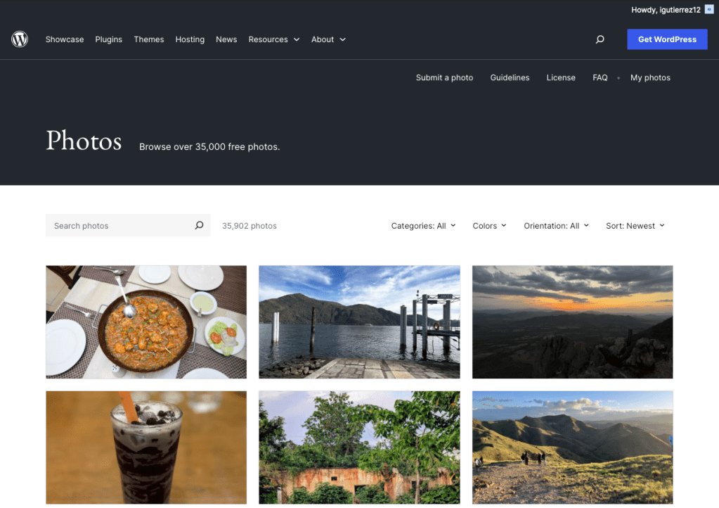El primero fue el directorio oficial de fotos en wordpress.org/photos. Esta es la página donde están publicadas las más de 30,000 imágenes con licencia CC0 de la comunidad. Desde ahí, en el menú superior, aparece la opción «Submit Your Photo», que es el formulario oficial para subir contribuciones. Navegar por el directorio también me sirvió para entender qué tipo de contenido ya existía y qué estilo predominaba: fotos limpias, sin marcas de agua, con buena composición y enfocadas a usos editoriales o de diseño web.